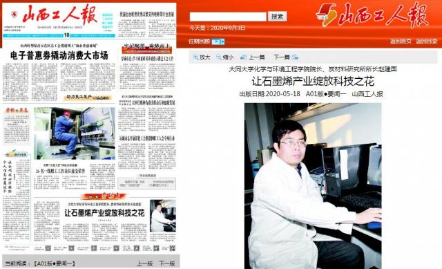 2006年,大同大學籌建成立了炭材料研究所。此后,趙建國帶領團隊成員以新型功能炭材料的開發及其綠色制備工藝技術為研究對象,重點研究炭/炭復合材料的低成本快速化制備工藝、高品質低成本的石墨烯規模化綠色制備工藝、石墨烯增效復合肥和石墨烯水性環氧漆制備及應用研究。