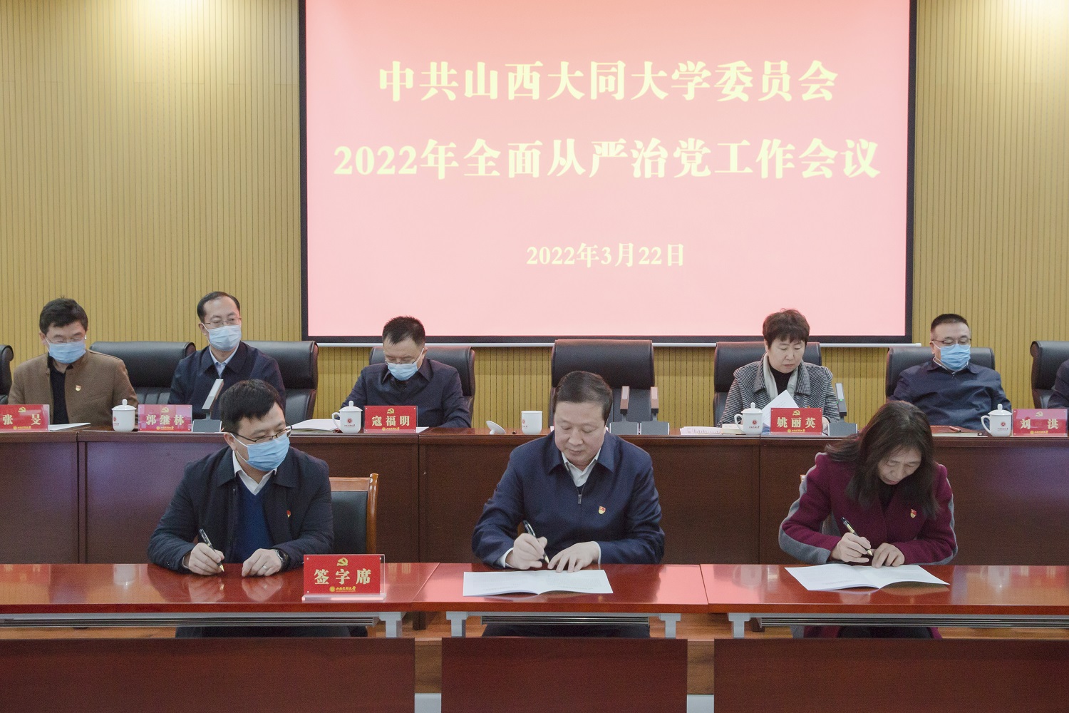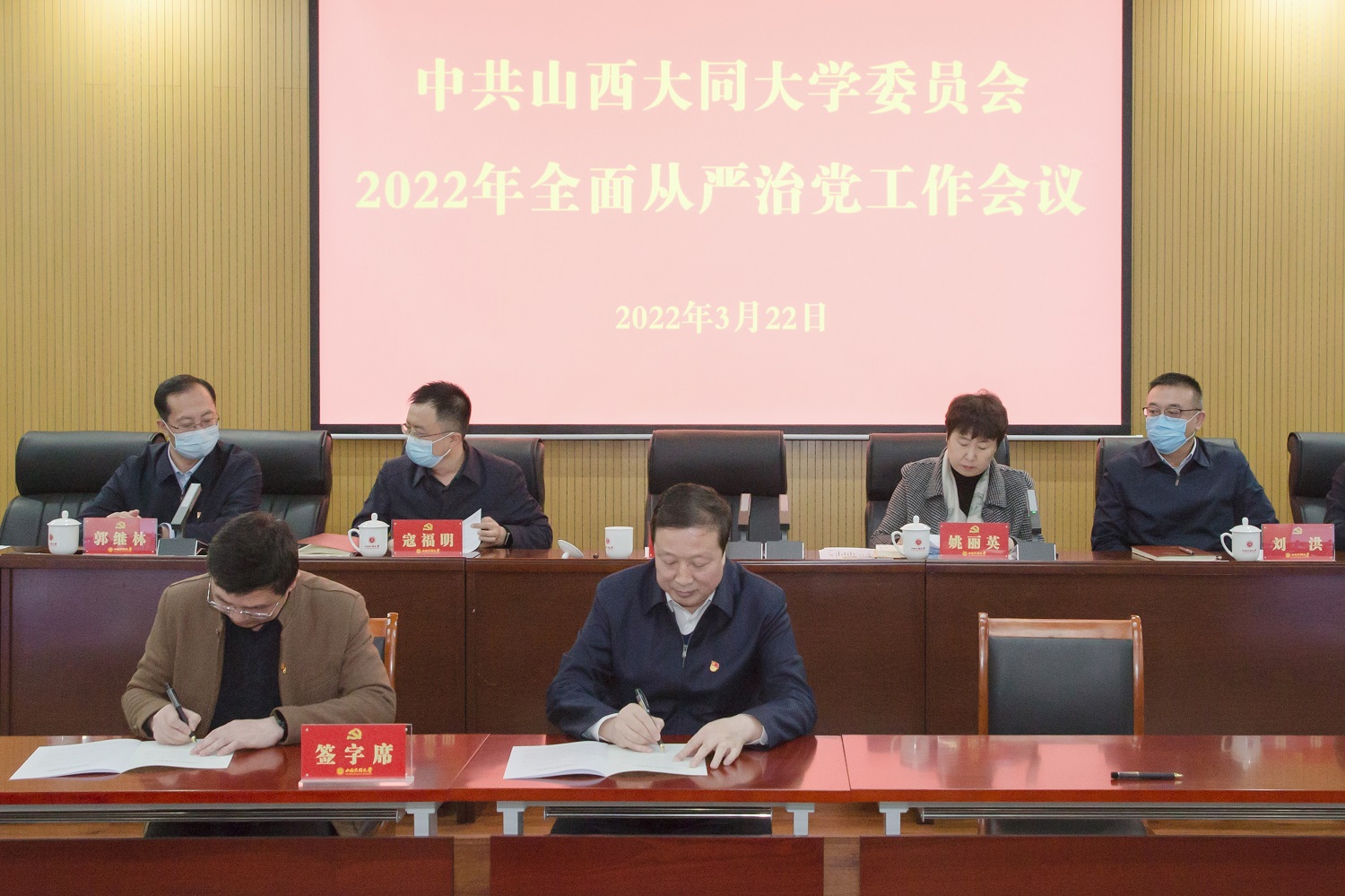 弓永華與校領(lǐng)導(dǎo)班子成員,學(xué)院、部門負(fù)責(zé)人簽署《2022年度全面從嚴(yán)治黨主體責(zé)任書(shū)》。