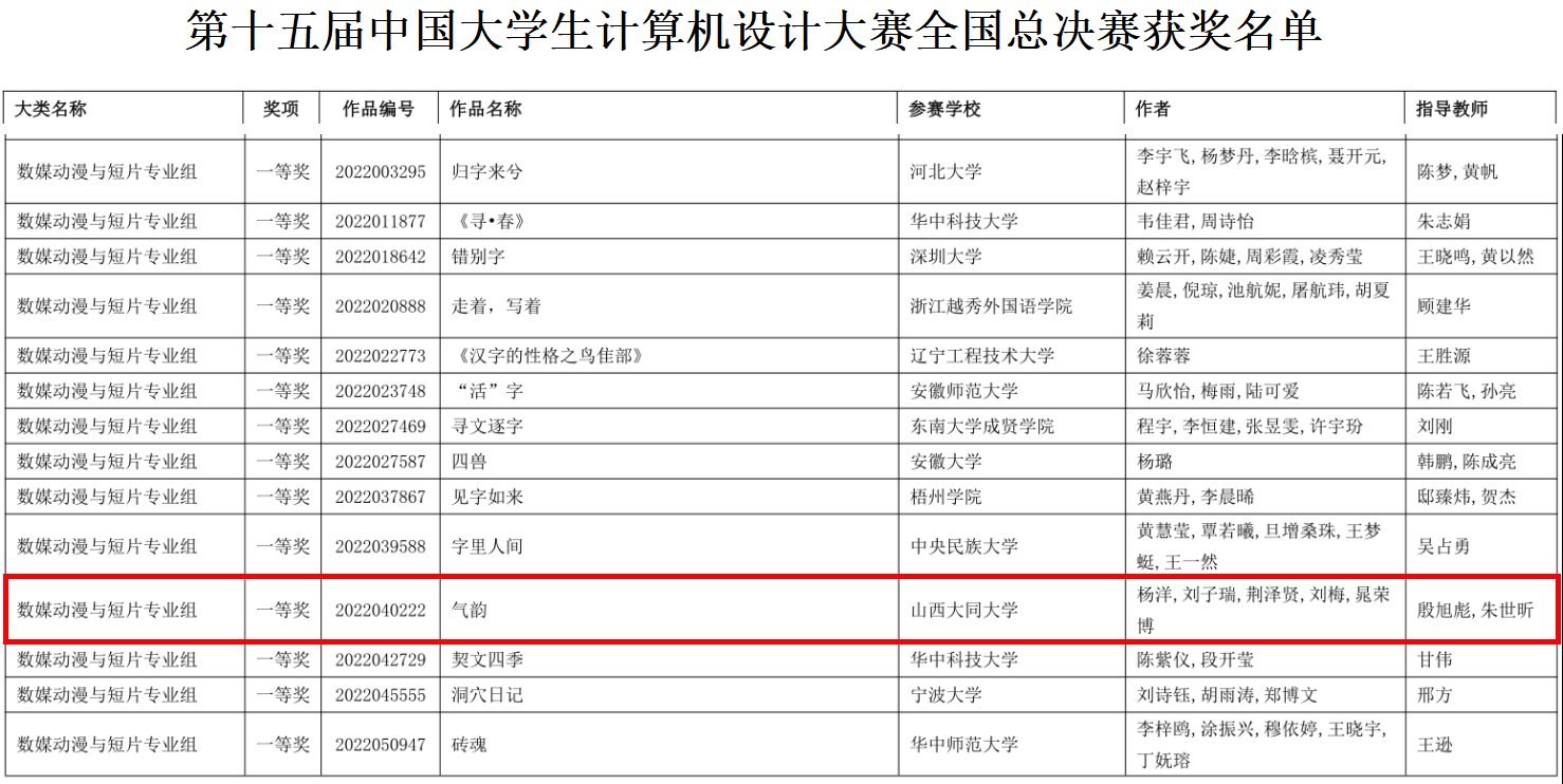 ?本屆大賽共有千余所高校參加,采取三級選拔賽制,賽事分為校級選拔賽、省級賽、全國決賽三級,通過各省級賽區選拔推薦參加國賽的共6518件作品,各類作品評出全國一等獎項占入圍國賽作品總數的4.5%,我省高校獲得全國一等獎2項,其中我校和山西大學各榮獲1項。在此前的山西賽區復賽選拔中,我校新聞與傳媒學院選送的參賽作品榮獲一等獎1項,二等獎8項,三等獎6項。