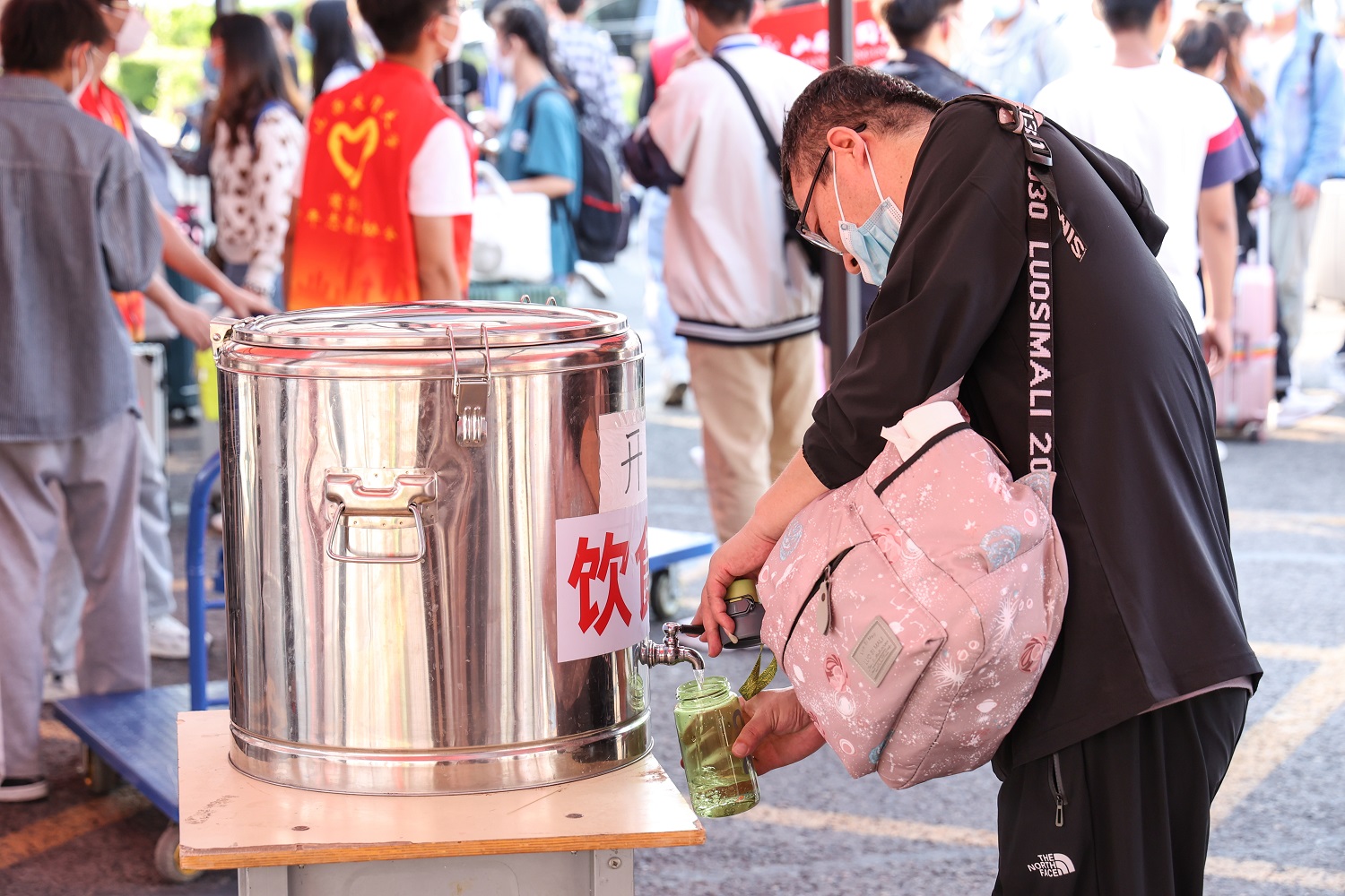 校園內耐心和藹的工作人員,熱情相迎的師生志愿者,來回穿梭的擺渡車,校門外搭起的一幢幢納涼帳篷,擺放的一桶桶解暑綠豆湯,還有新調來的移動公廁,無不讓家長們感到安心、暖心:孩子有人關照,行李有車給搬,還有啥不放心的!