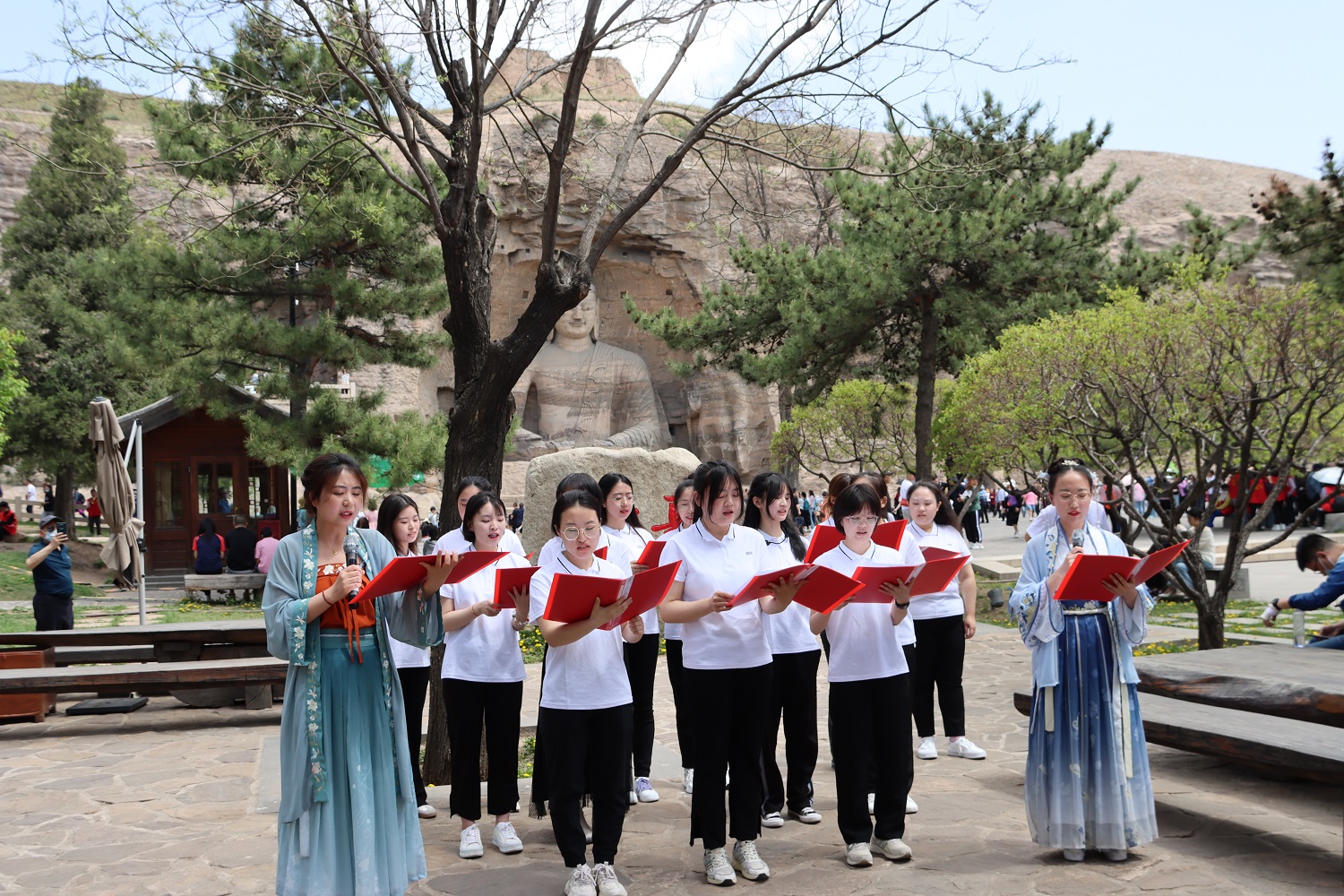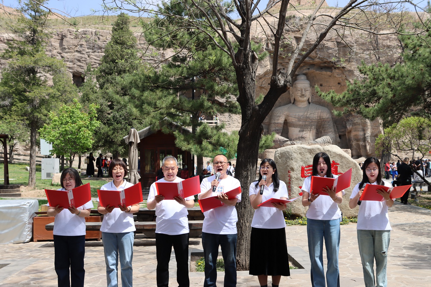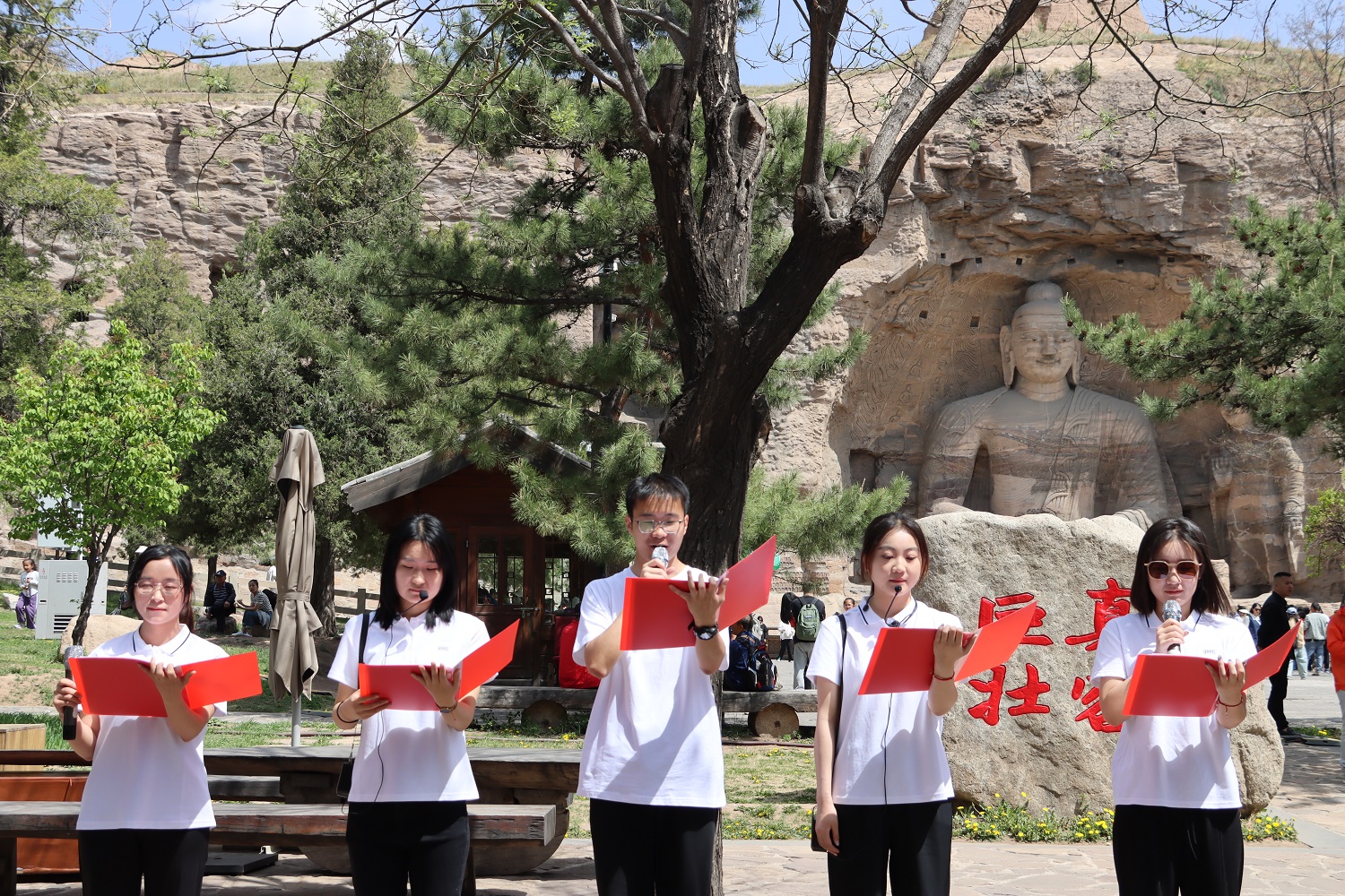 參觀完畢后,全體師生開啟了云岡石窟主題原創詩歌誦讀會。本次研學實踐活動也是一次特色鮮明的師生讀書會,誦讀作品全部選自文學院教師和研究生的原創作品《石破奏清音云岡詩文集》,旨在通過原創詩文的創作和誦讀向燦爛厚重的云岡文化致敬。《石破奏清音云岡詩文集》是2022年5月文學院師生為同大、為大同、為新時代云岡文化貢獻的一部智慧結晶,全集共收錄詩、詞、文、賦4大類500余篇原創作品。誦讀會吸引了現場眾多游客觀看。劉世明朗誦的本人作品《云岡賦》,文學院導師集體朗誦的《盛世東方,韻集云岡》,黨委研究生工作部集體朗誦的現代詩《千年云岡》,以及研究生們朗誦的《云岡風情》《云岡石窟》《嘆中華古跡》等詩作,充分展現了壯美的云岡石窟與深厚的文化內涵,并融入了濃厚的自信和深沉的情感,引起了與會師生和游客們的廣泛共鳴。