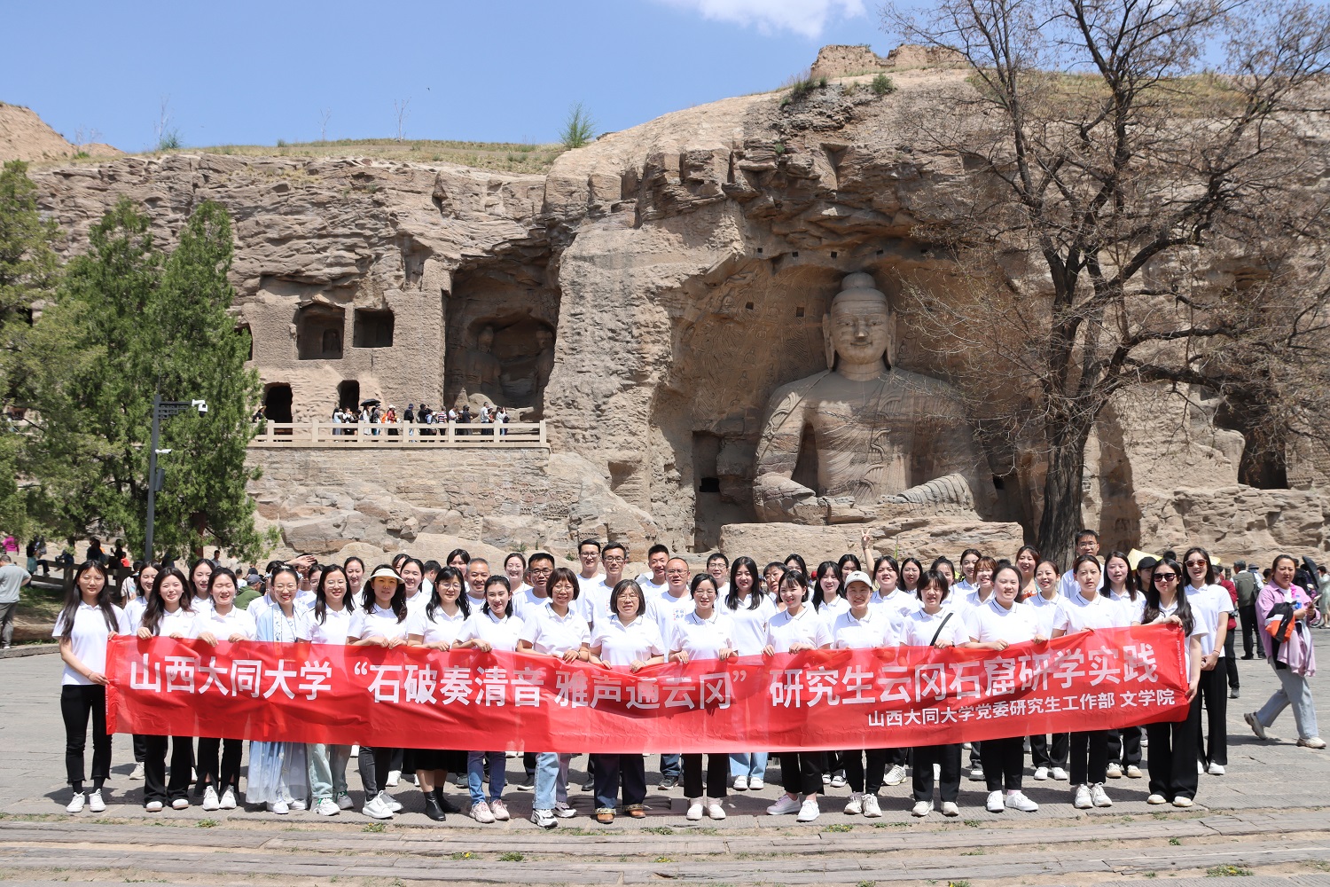 在全校深入開展學習貫徹習近平新時代中國特色社會主義思想主題教育之際,5月14日,黨委研究生工作部和文學院在云岡石窟成功舉辦“石破奏清音,雅聲誦云岡”研究生云岡石窟主題研學實踐活動。活動旨在加強研究生思想政治引領,突出中國語言文學學科研究生培養專業特色,引導研究生主動參與主題教育,深入學習貫徹習近平總書記視察云岡石窟重要指示精神,增進研究生了解、傳承、研究、弘揚云岡文化的使命擔當。黨委研究生工作部部長白昕,副部長張繼紅、蘇新武及部門其他人員,文學院副院長劉世明、部分研究生導師代表以及研究生代表共50余人參加活動。