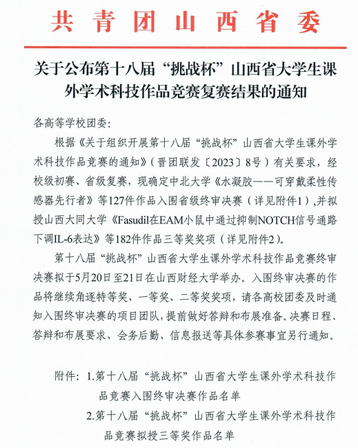 第十八屆“挑戰(zhàn)杯”山西省大學(xué)生課外學(xué)術(shù)科技作品競賽入圍終審決賽作品名單