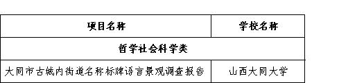 近日,第十八屆“挑戰(zhàn)杯”山西省大學(xué)生課外學(xué)術(shù)科技作品競賽結(jié)果揭曉,我校共有7件作品榮獲三等獎,其中,哲學(xué)社會科學(xué)類《大同市古城內(nèi)街道名稱標(biāo)牌語言景觀調(diào)查報告》(負(fù)責(zé)人:茍俊暉,指導(dǎo)老師:崔霞)項目進(jìn)入終審決賽,決賽擬于5月20日至21日在山西財經(jīng)大學(xué)舉辦,入圍終審決賽的作品將繼續(xù)角逐特等獎、一等獎、二等獎獎項。
