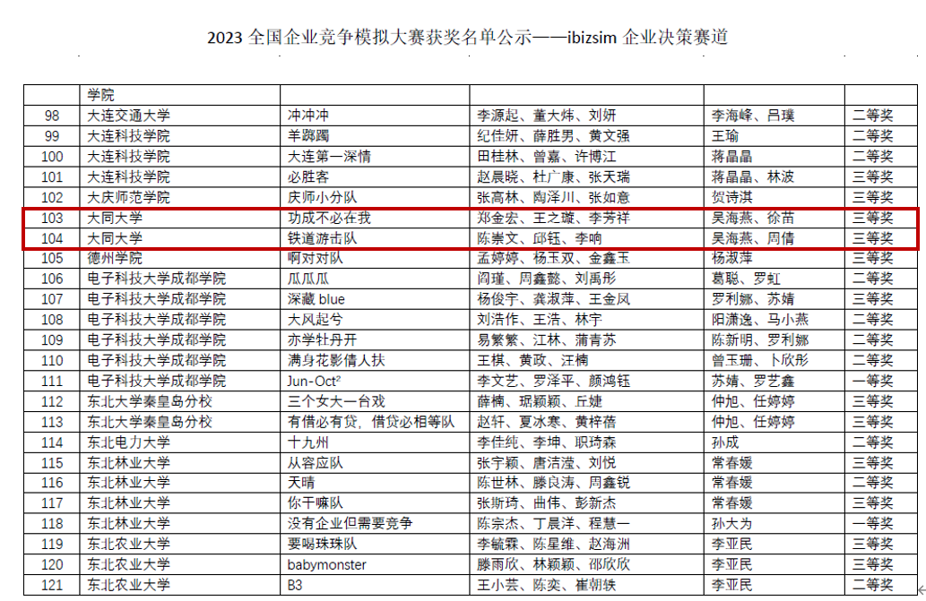 5月20日,由中國管理現代化研究會決策模擬專業委員會主辦的第十四屆全國企業競爭模擬大賽(本科組)正式落下帷幕,本次大賽分為校內初賽、全國復賽、全國半決賽、全國總決賽四階段。大賽自3月7日啟動以來,有來自全國381所院校共計3356支隊伍報名參賽,最終我校商學院由吳海燕、周倩、徐苗老師指導的2020級物流管理二班學生鄭金宏、王之璇、李芳祥組成的“功成不必在我隊”和2022級物流管理一班學生陳崇文、邱鈺、李響組成的“鐵道游擊隊”榮獲全國三等獎的佳績。