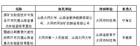 煤礦水射流技術(shù)與裝備廳市共建山西省重點實驗室培育基地是山西大同大學(xué)和山西省晉神能源有限公司、大同市同華礦機制造有限公司聯(lián)合共建,負(fù)責(zé)人是寧掌玄;圍絕經(jīng)期激素代謝性疾病廳市共建山西省重點實驗室培育基地是大同市第一人民醫(yī)院和山西大同大學(xué)聯(lián)合共建,我校的負(fù)責(zé)人是張年萍。