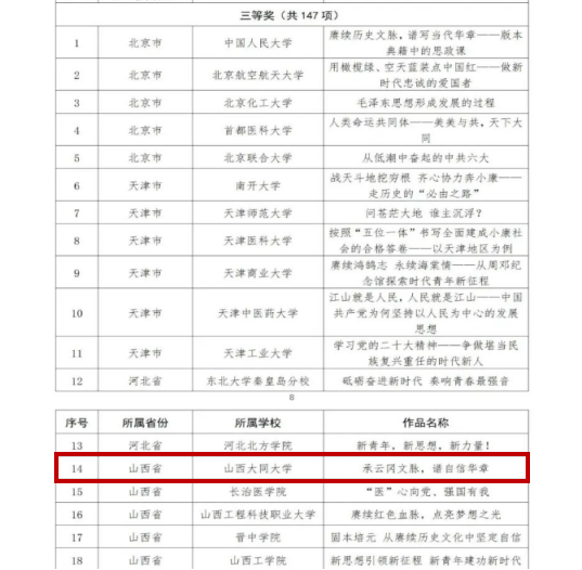 活動自2023年6月啟動,歷時半年,全國高校廣泛參與。我校高度重視,宣傳部認真謀劃,協同馬克思主義學院,組織全校各學院黨委積極落實。期間,派出思政課教師指導大學生組建團隊,圍繞思政課有關章節或專題進行教學設計,共征集優秀作品?部,從中遴選出馬克思主義學院報送的《承云岡文脈,譜自信華章》等?部作品作進一步精心指導并上報活動主委會。