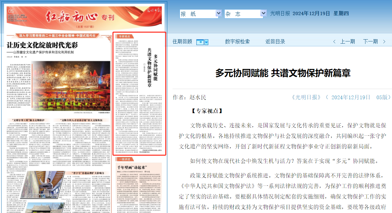 2024年12月19日,《光明日報》在第5版刊發了校黨委書記趙水民署名文章《多元協同賦能 共譜文物保護新篇章》,全文如下: