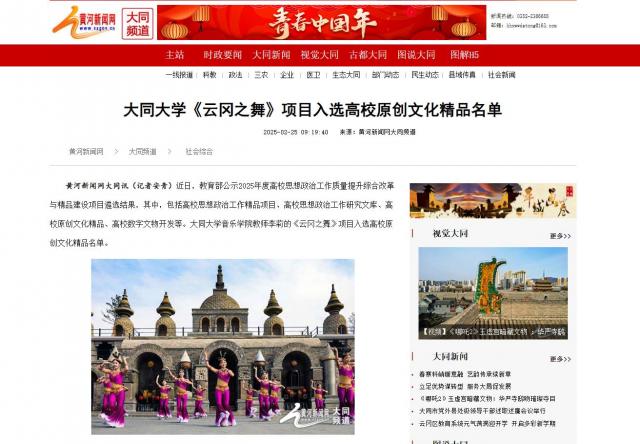黃河新聞網大同訊(記者 安青)近日,教育部公示2025年度高校思想政治工作質量提升綜合改革與精品建設項目遴選結果,其中,包括高校思想政治工作精品項目、高校思想政治工作研究文庫、高校原創文化精品、高校數字文物開發等。大同大學音樂學院教師李莉的《云岡之舞》項目入選高校原創文化精品名單。