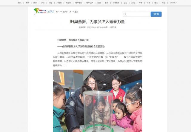 這是山西省共青團構建“引才育才用才留才”全鏈條機制的生動縮影。2025年寒假,團省委結合團中央“共青團促進大學生就業行動”和全省實習實訓工作部署安排,聚焦“青春為中國式現代化挺膺擔當”主題,立足主責主業,突出實踐育人,累計動員14934名大學生參與“青春興晉”大學生“返家鄉”社會實踐,引導廣大青年學子扎根三晉大地,在投身基層建設、服務家鄉發展中堅定信念、增長本領、作出貢獻。