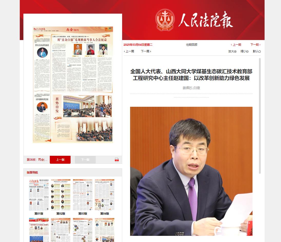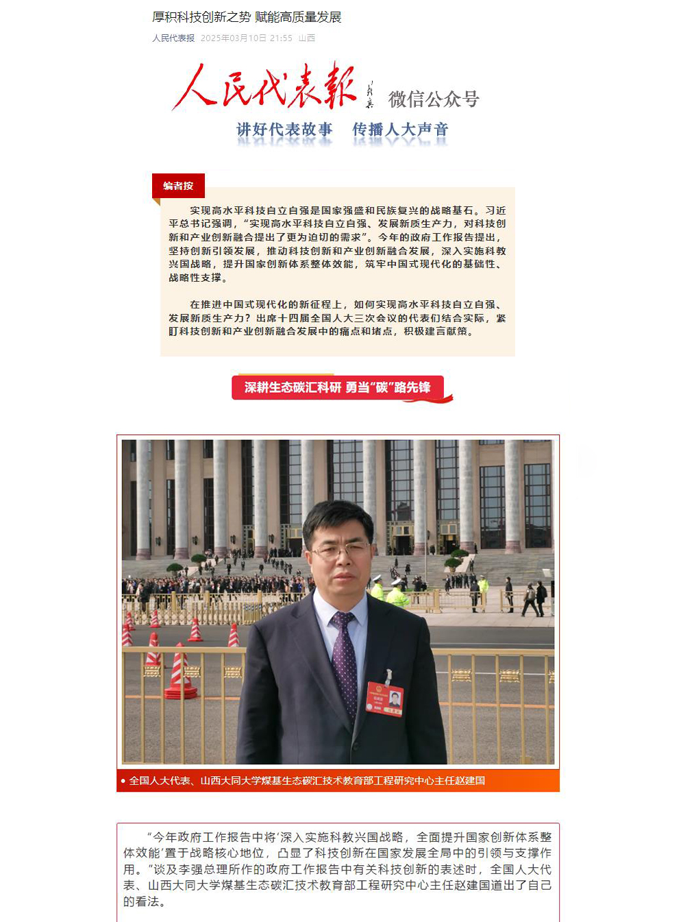3月6日,中華人民共和國最高人民法院官網、《人民法院報》推出專題報道《全國人大代表、山西大同大學煤基生態碳匯技術教育部工程研究中心主任趙建國:以改革創新助力綠色發展》,趙建國表示,希望通過科技賦能司法,織牢織密生態環境保護網,一體推動山西“四山”“兩河”、長城、石窟生態環境保護,在守護美麗大同、美麗山西上充分展現全國人大代表的擔當作為。