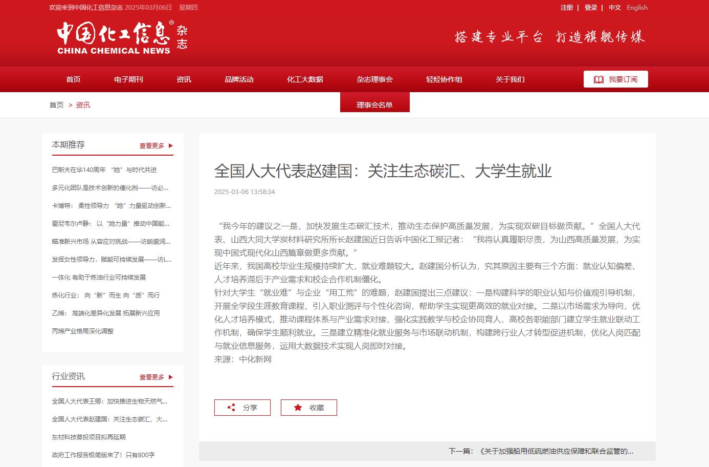3月6日,《中國化工信息》雜志發文《全國人大代表趙建國:關注生態碳匯、大學生就業》,文中,趙建國接受采訪,他表示,“我今年的建議之一是,加快發展生態碳匯技術,推動生態保護高質量發展,為實現“雙碳”目標做貢獻。我將認真履職盡責,為山西高質量發展,為實現中國式現代化山西篇章做出更多貢獻。”針對大學生“就業難”與企業“用工荒”的難題,趙建國提出三點建議:一是構建科學的職業認知與價值觀引導機制,開展全學段生涯教育課程,引入職業測評與個性化咨詢,幫助學生實現更高效的就業對接。二是以市場需求為導向,優化人才培養模式,推動課程體系與產業需求對接,強化實踐教學與校企協同育人,高校各職能部門建立學生就業聯動工作機制,確保學生順利就業。三是建立精準化就業服務與市場聯動機制,構建跨行業人才轉型促進機制,優化人崗匹配與就業信息服務,運用大數據技術實現人崗即時對接。