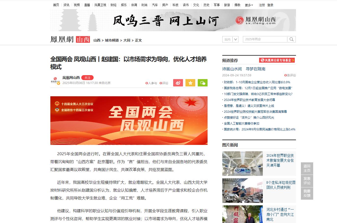 3月6日,鳳凰網山西頻道推出專題報道《全國兩會鳳觀山西丨趙建國:以市場需求為導向,優化人才培養模式》,趙建國接受采訪,他建議,構建科學的職業認知與價值觀引導機制,開展全學段生涯教育課程,引入職業測評與個性化咨詢,幫助學生實現更高效的就業對接;以市場需求為導向,優化人才培養模式,推動課程體系與產業需求對接,強化實踐教學與校企協同育人,高校各職能部門建立學生就業聯動工作機制,確保學生順利就業;建立精準化就業服務與市場聯動機制,構建跨行業人才轉型促進機制,優化人崗匹配與就業信息服務,運用大數據技術實現人崗即時對接。(文字:余致楠 責編:趙鑫)