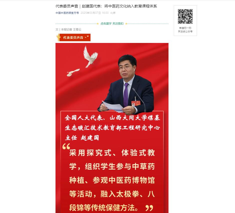 2025年全國兩會進行時。在晉全國人大代表和住晉全國政協委員肩負三晉人民重托,帶著沉甸甸的“山西方案”赴京履職。全國人大代表、山西大同大學煤基生態碳匯技術教育部工程研究中心主任趙建國與來自全國各地的代表委員匯聚國家最高議政殿堂,共商國計民生、共謀改革良策、共繪發展藍圖。期間,《人民代表報》、中華人民共和國最高人民法院官網、《人民法院報》、中國經濟網、《中國中醫藥報》《中國化工信息》雜志、人民網山西、鳳凰網山西等多家國家級、省級媒體,先后報道了趙建國兩會期間的履職建言情況,體現了人大代表情系民生、參政為民的政治情懷,展現了新時代大學教育和科技工作者昂揚向上、積極進取的精神風貌。