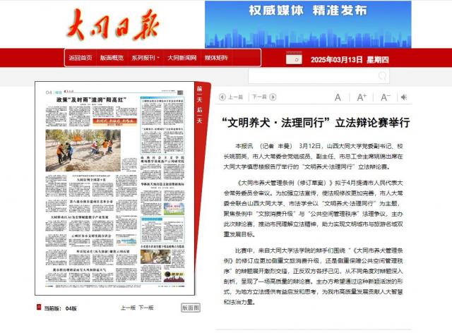 《大同市養犬管理條例(修訂草案)》擬于4月提請市人民代表大會常務委員會審議。為加強立法宣傳,使法規修改更加完善,市人大常委會聯合山西大同大學、市法學會以“文明養犬·法理同行”為主題,聚焦條例中“文旅消費升級”與“公共空間管理秩序”法理爭議,主辦此次辯論賽,推動市民理解立法精神,助力實現文明城市與旅游名城雙重發展目標。