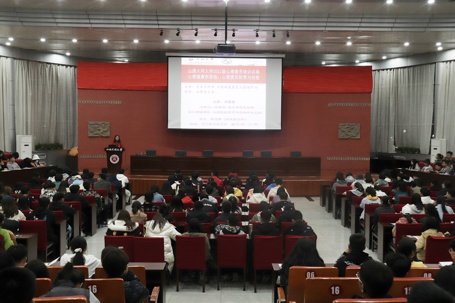 10月26日晚,2021級班級心理委員培訓系列講座在科技報告廳開講,由此拉開了我校第十屆心理委員培訓活動的序幕。全校400余位心理委員參加了培訓。第一講的主題為“心理健康你我他:心理委員職責與技能”。