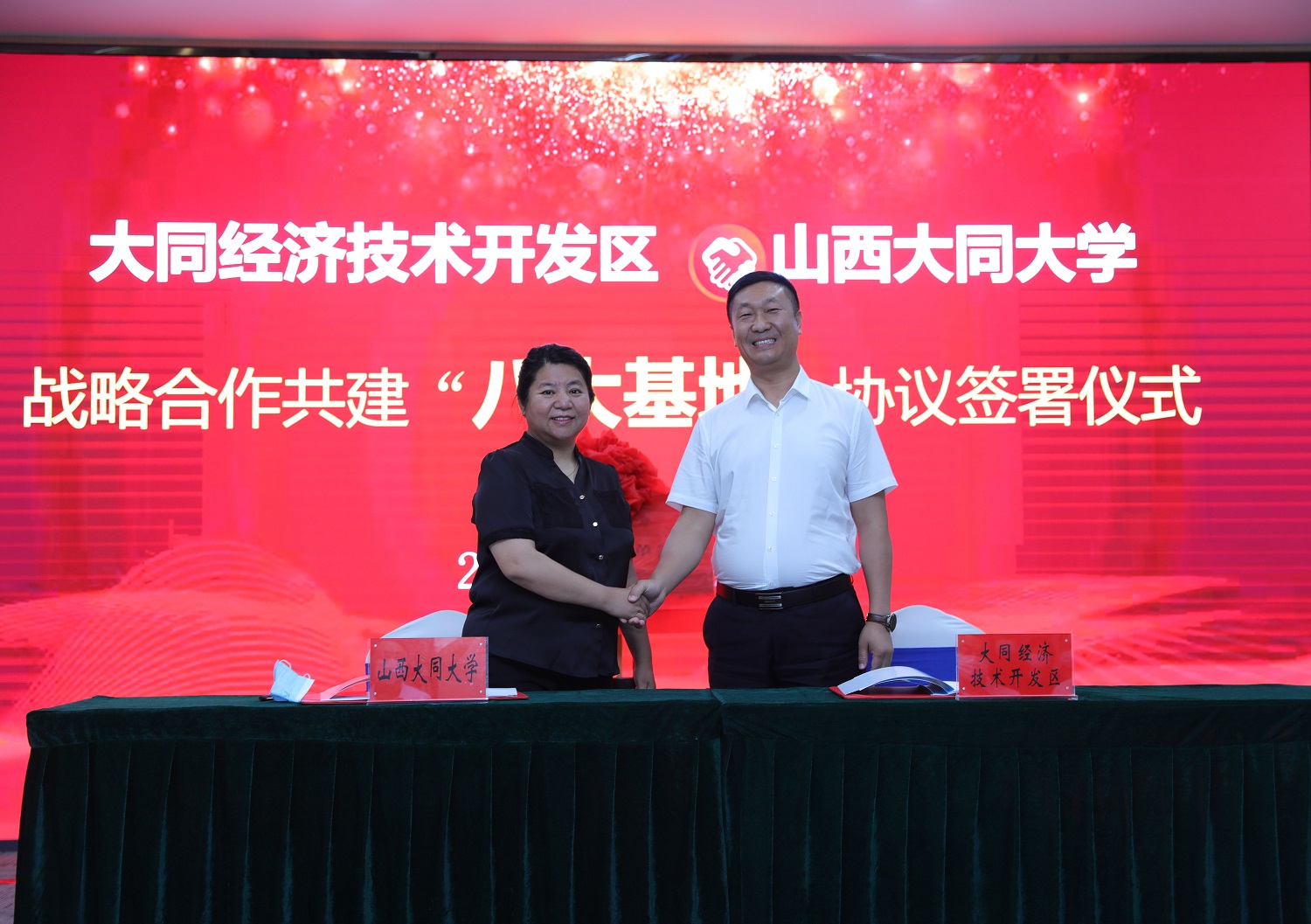 7月22日上午,我校與大同經濟技術開發區簽署共建“八大基地”戰略合作協議。這是校地雙方深入貫徹習近平總書記視察山西重要講話重要指示精神,大力實施科教創新和人才強省戰略,深入推進省委省政府省校合作戰略,共謀合作共贏共促高質量發展的重要舉措。校黨委書記趙水民,大同市人民政府副市長、大同經濟開發區黨工委書記、主任趙學斌出席儀式并致辭。校黨委副書記寇福明,校黨委常委、副校長石鳳珍,校黨委常委、副校長史水鴻,大同經濟技術開發區黨工委委員、管委會副主任祝日杰出席儀式。大同經濟技術開發區黨工委委員孫娜主持儀式。