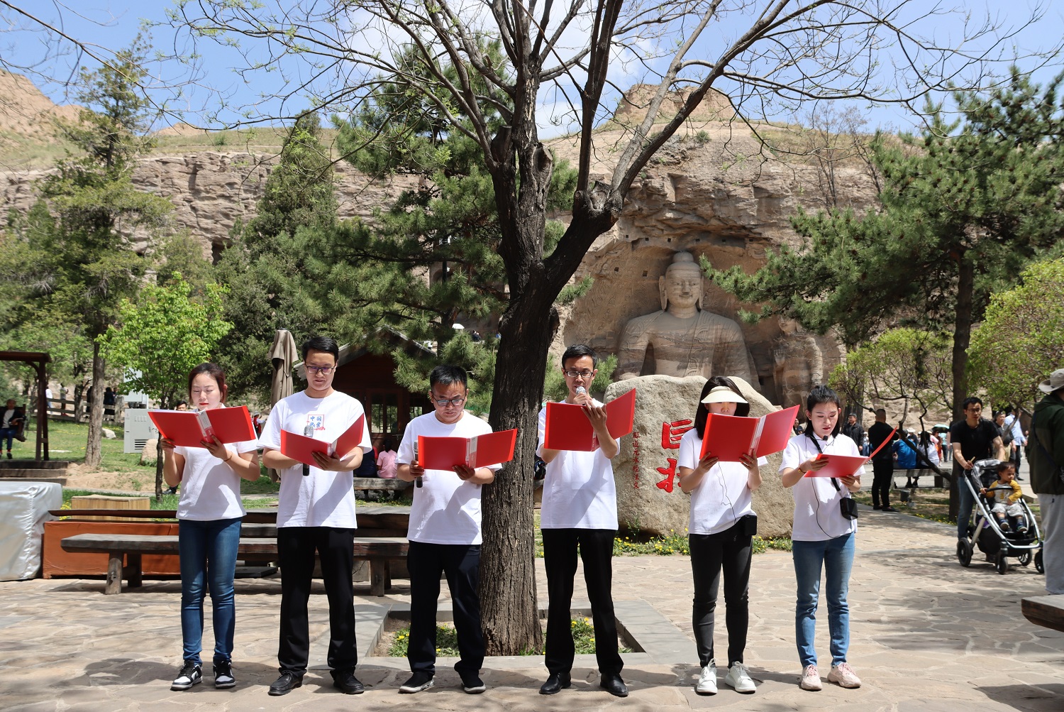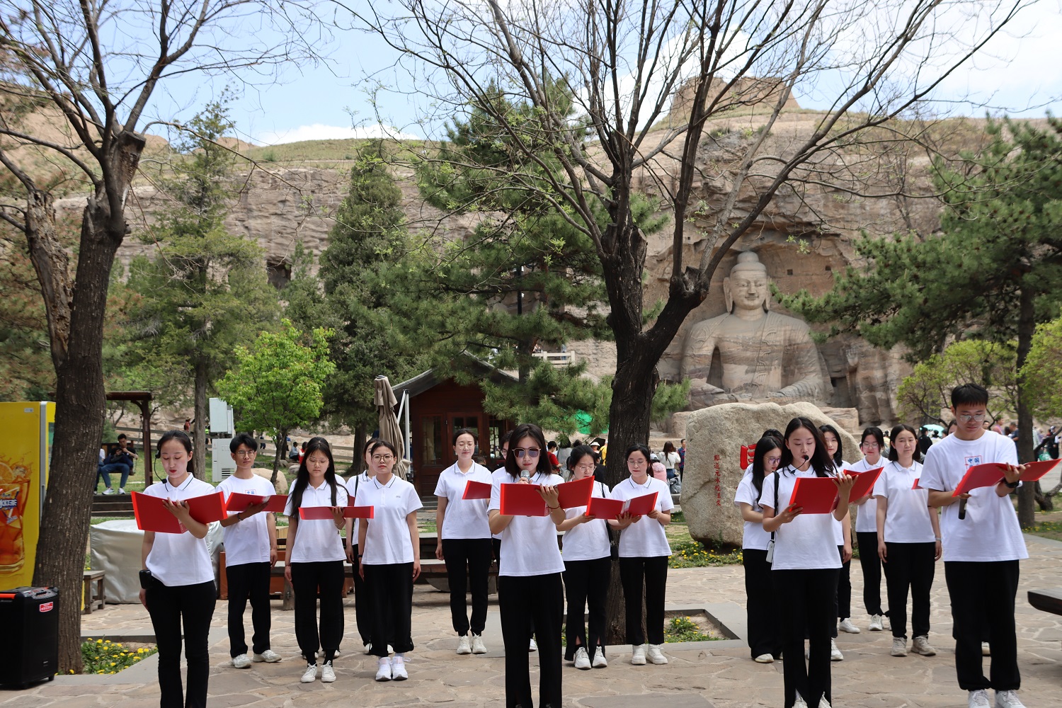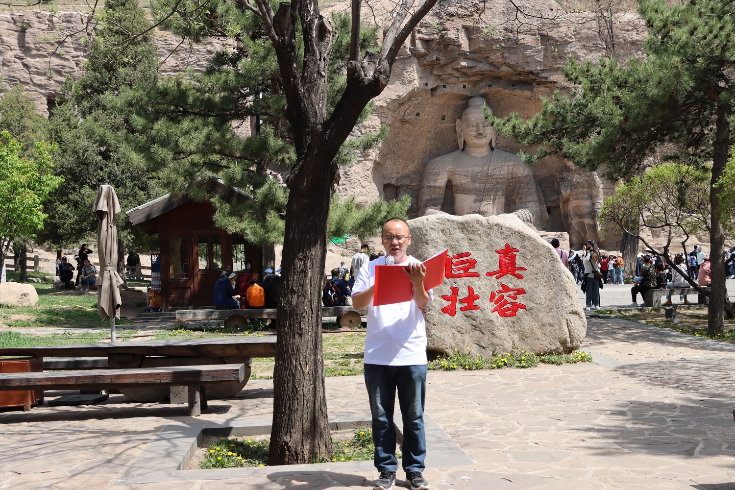 參觀完畢后,全體師生開啟了云岡石窟主題原創詩歌誦讀會。本次研學實踐活動也是一次特色鮮明的師生讀書會,誦讀作品全部選自文學院教師和研究生的原創作品《石破奏清音云岡詩文集》,旨在通過原創詩文的創作和誦讀向燦爛厚重的云岡文化致敬。《石破奏清音云岡詩文集》是2022年5月文學院師生為同大、為大同、為新時代云岡文化貢獻的一部智慧結晶,全集共收錄詩、詞、文、賦4大類500余篇原創作品。誦讀會吸引了現場眾多游客觀看。劉世明朗誦的本人作品《云岡賦》,文學院導師集體朗誦的《盛世東方,韻集云岡》,黨委研究生工作部集體朗誦的現代詩《千年云岡》,以及研究生們朗誦的《云岡風情》《云岡石窟》《嘆中華古跡》等詩作,充分展現了壯美的云岡石窟與深厚的文化內涵,并融入了濃厚的自信和深沉的情感,引起了與會師生和游客們的廣泛共鳴。