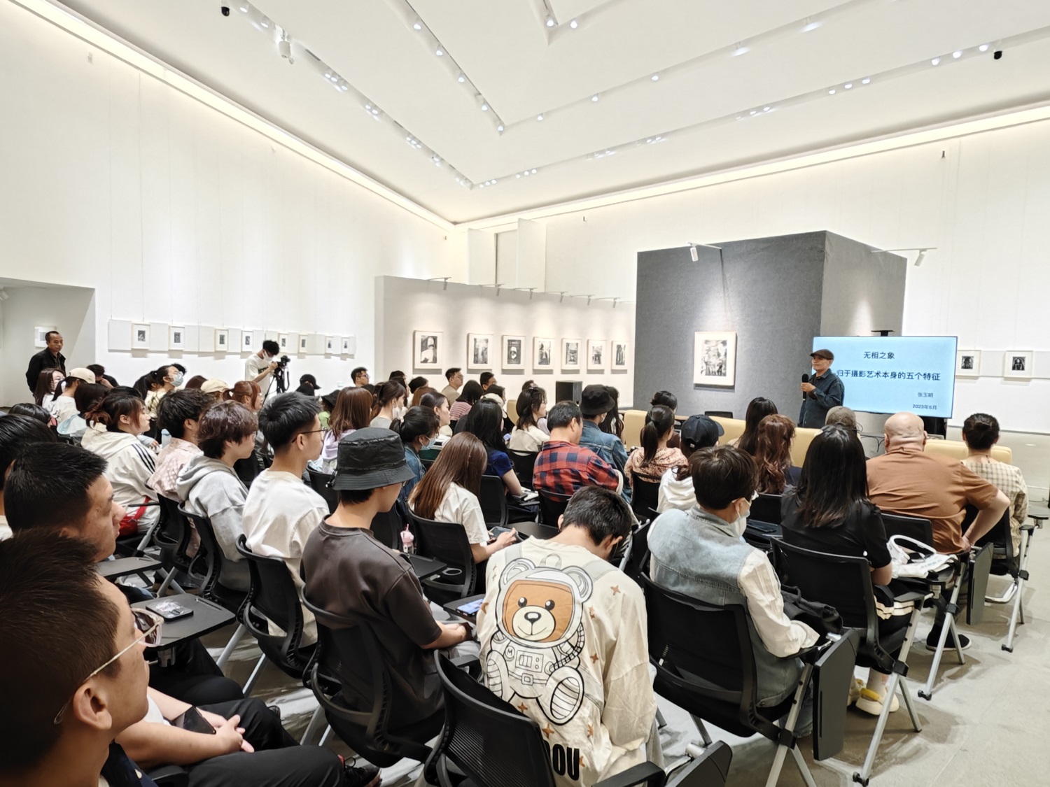 張玉明的講座《無相之象——歸于攝影藝術本身的五個特征》從被稱為美國當代攝影家薩考夫斯基提出的“它本身、框取、細節、時間、優勢點”5個攝影藝術共同特征入手,深入分析了攝影語言作為藝術與哲學的內在關聯。他認為,照片和照片上的事物之間的聯系是不確定的,因為它印證的是藝術家的內心。攝影家的信息純粹是視覺化的,“照片中表現的任何含義只能看不能說”;不相干的事物框取在一個畫面內也能產生新的象征,這就是其框取的作用和意義所在;由形狀、線條、明暗、質感、趣味中心組成的“細節”,是拍攝對象“固有”的,而不是像繪畫那樣是“給予”的;照片是對時間流的截取,也就是某個時間段的表達;其“優勢點”在于把俯視與仰視、長焦與廣角、隱藏在影子里,通過玻璃的反光,帶給我們不同凡響的攝影經驗。
