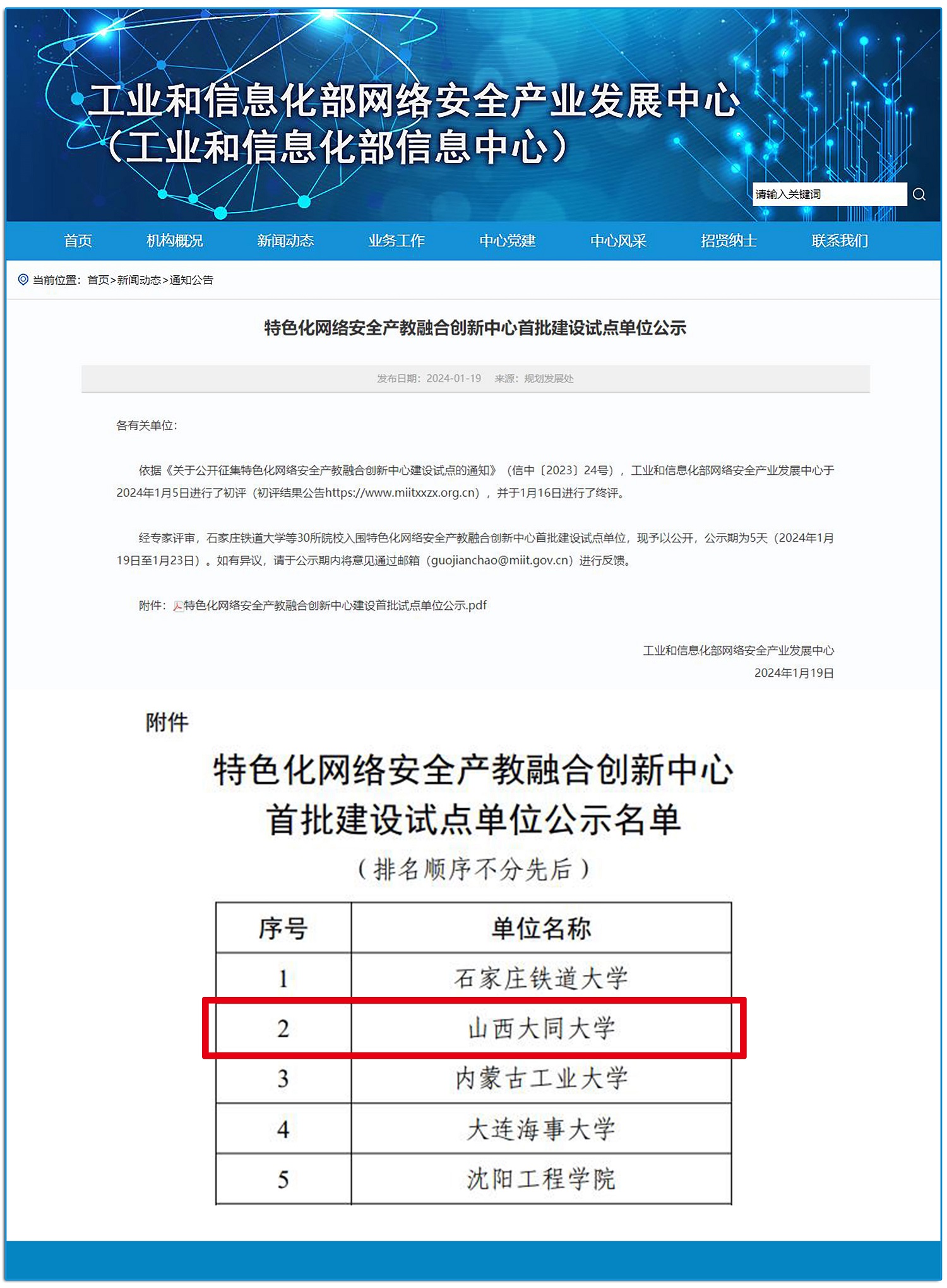 近日,工業和信息化部網絡安全產業發展中心(以下簡稱網安中心)公布了特色化網絡安全產教融合創新中心首批建設試點單位,我校名列其中,成為山西省唯一入選高校。