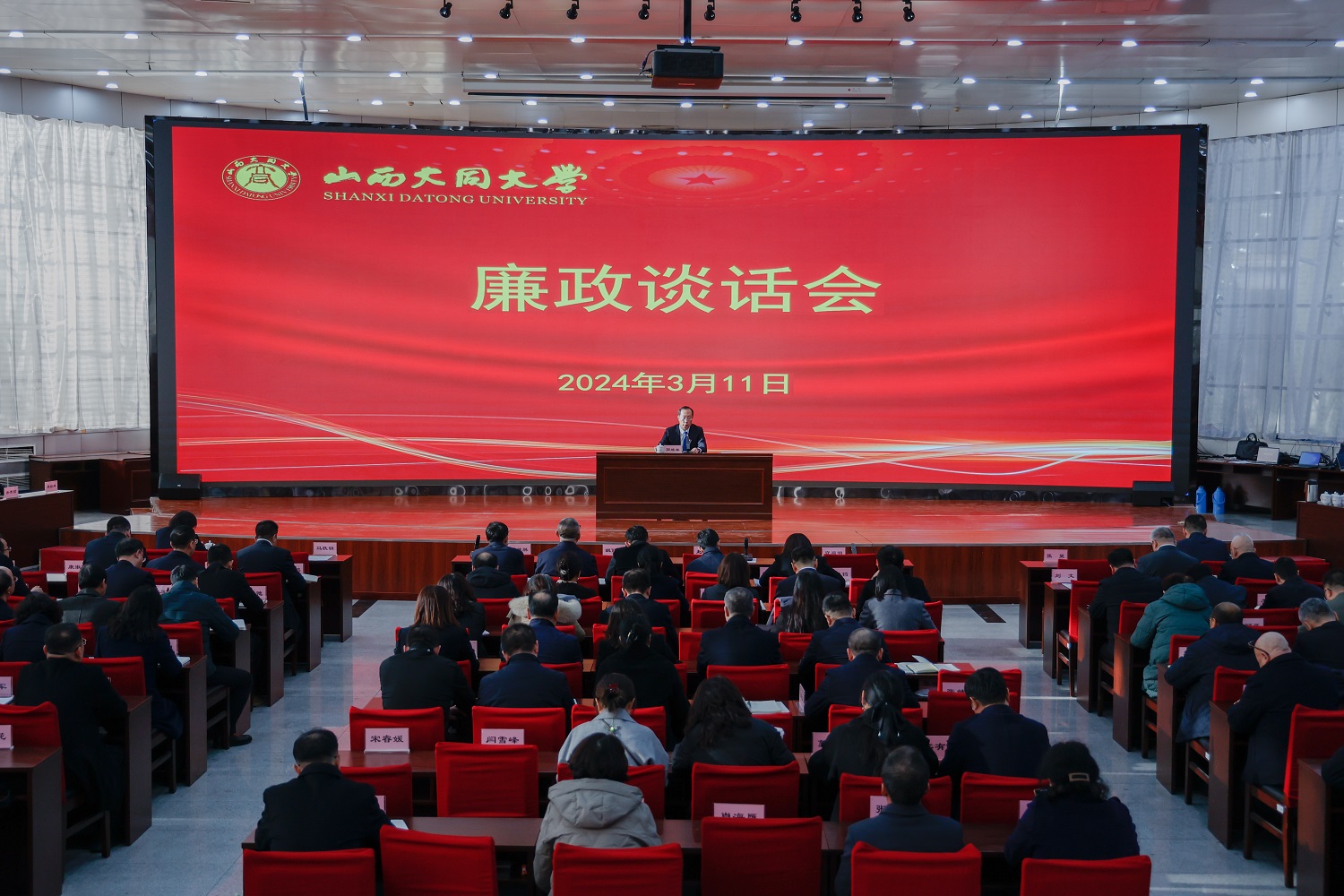 ? 3月11日下午,校紀委對全校處級以上領導干部進行集體廉政談話。校黨委常委、紀委書記、監察專員郭繼林主持會議并講話。