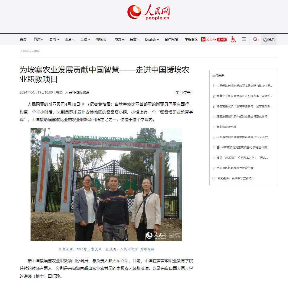 4月18日,人民網國際頻道報道我校教師田巧珍參與中國援助埃塞俄比亞農業職教項目的故事。