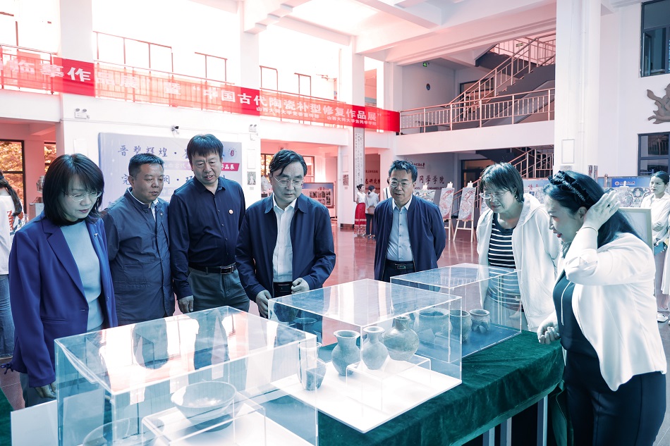 趙水民等與師生們認真觀摩了展出的作品,與云岡學(xué)學(xué)院班子成員及負責(zé)講解的師生們深入交流,共同探討同大云岡學(xué)建設(shè)之路。作為學(xué)校第十七屆校園文化藝術(shù)節(jié)、學(xué)院第三屆“云岡文化月”系列活動之一,該展共展出以山西寺觀壁畫為主題的20余幅壁畫臨摹作品、120件陶瓷修復(fù)器具,年代跨度從春秋戰(zhàn)國至明清。云岡學(xué)學(xué)院師生積極參與到講解中,通過專業(yè)視角和專業(yè)知識,向來賓們介紹壁畫藝術(shù)特色、陶瓷器的制作工藝及其修復(fù)技術(shù)。