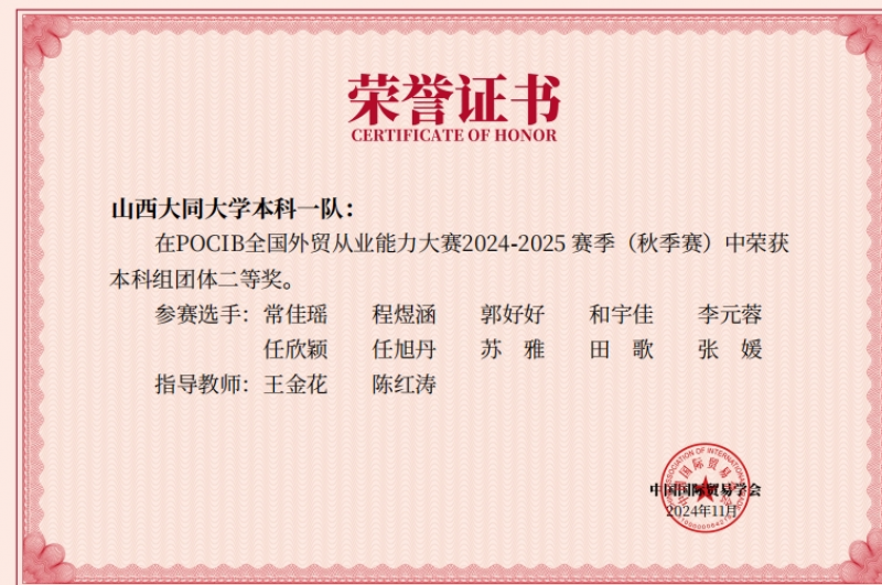 近日,由中國國際貿(mào)易學(xué)會主辦的第十四屆POCIB全國外貿(mào)從業(yè)能力大賽落下帷幕。本次大賽共有來自全國951支團隊參賽,參賽選手總數(shù)9510人。我校外國語學(xué)院商務(wù)英語系10名同學(xué)報名參賽,在副院長王金花和教師陳紅濤的精心指導(dǎo)下,榮獲本次大賽本科組團體二等獎,其中程煜涵榮獲個人二等獎,田歌、常佳瑤、蘇雅和任欣穎榮獲個人三等獎。