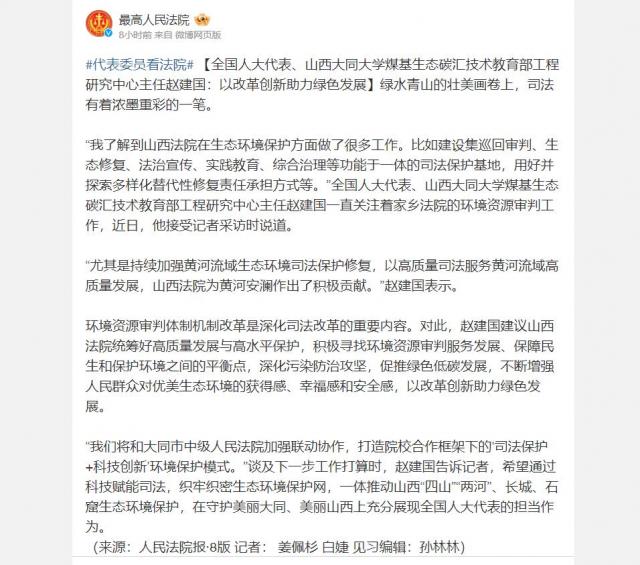 #代表委員看法院#【全國人大代表、山西大同大學煤基生態(tài)碳匯技術(shù)教育部工程研究中心主任趙建國:以改革創(chuàng)新助力綠色發(fā)展】綠水青山的壯美畫卷上,司法有著濃墨重彩的一筆。