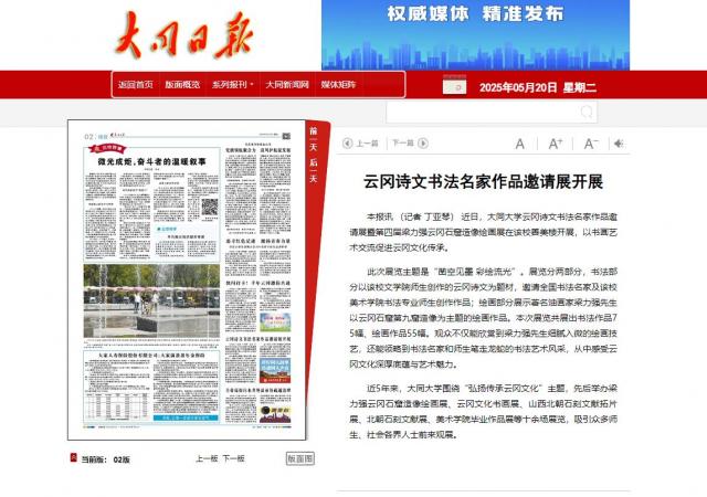 本報訊(記者 丁亞琴)近日,大同大學云岡詩文書法名家作品邀請展暨第四屆梁力強云岡石窟造像繪畫展在該校善美樓開展,以書畫藝術交流促進云岡文化傳承。