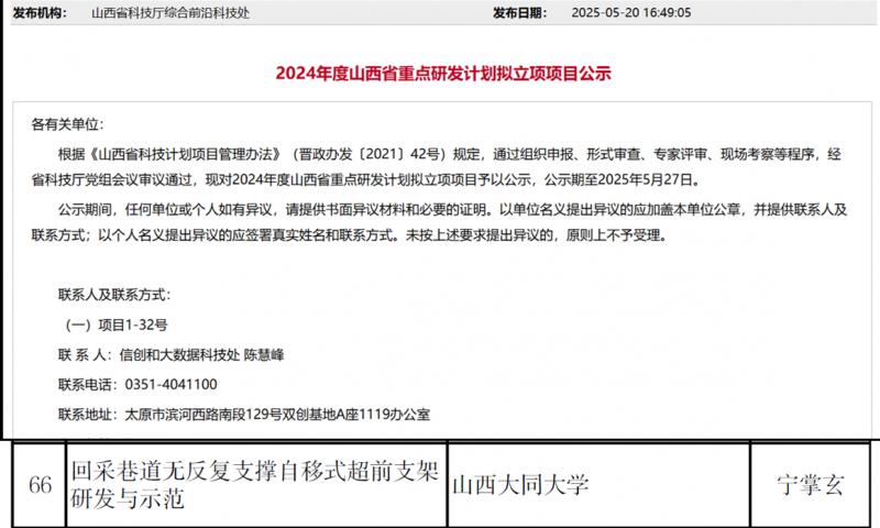 5月20日,山西省科學技術廳發布了“2024年度山西省重點研發計劃擬立項項目公示”,我校二級教授寧掌玄主持的“回采巷道無反復支撐自移式超前支架研發與示范”項目獲批立項,這是我校近五年來獲批的第二項省重點研發。